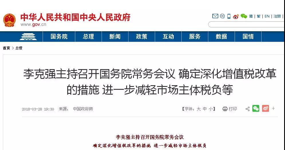 2018年3月28日國務(wù)院常務(wù)會議決定,將制造業(yè)等行業(yè)增值稅稅率從17%降至16%,將交通運(yùn)輸、建筑、基礎(chǔ)電信服務(wù)等行業(yè)及農(nóng)產(chǎn)品等貨物的增值稅稅率從11%降至10%,預(yù)計全年可減稅2400億元。