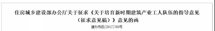 2017年11月,住建部印發(fā)關(guān)于《關(guān)于培育新時期建筑產(chǎn)業(yè)工人隊伍的指導意見(征求意見稿)》(建辦市函[2017]763號)。